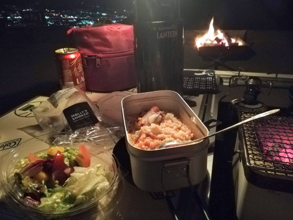 タープ張りもメスティンでの料理も結構うまくいきました~。