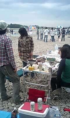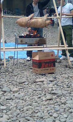 投稿日: 2009年5月16日● 初めて見た! 豚の丸焼き ↓ニコタマで七輪やってたら、すぐ後ろにいたグループが大袈裟にいろいろなモノを取り出し始め、よくよくみれば豚が丸々1頭。丸焼きに挑戦し始めた。豚インフルの渦中に!(ま、直接は関係ないけどね) あまり手馴れてない感じのグループだったので、 なんだか心配。 火力も弱々しいゾ。 やっぱジムシー(未来少年コナンの相棒)みたいに、大型の焚き火の直火でやんなきゃねー。 最後まで見届けられなかったけど、ちゃんと喰えたのだろうか?