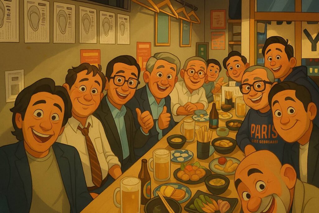 ④年賀状のみだった繋がりもコロナを挟んでほぼなくなりかけていた中、年賀状にだけ書いているこのサイトのURLを通じて、仲人でもあるゼロックス時代の上司から連絡が届き、トントン拍子で当時の配属先チームの上司・先輩・後輩たちとの飲み会が、これまた懐かしい新橋烏森口周辺で開催。2つも3つも下の後輩たちも、すっかりかっぷくのあるオジサンになってて可笑しい。 サラリーマンの聖地と言われてた新橋も、昔と違って若い輩や異国人がずいぶんと目立ち、店内もかなりうるさい。喧騒にのまれ、話そうとしていた話題も話せず「老いるショック」を感じてしまう。