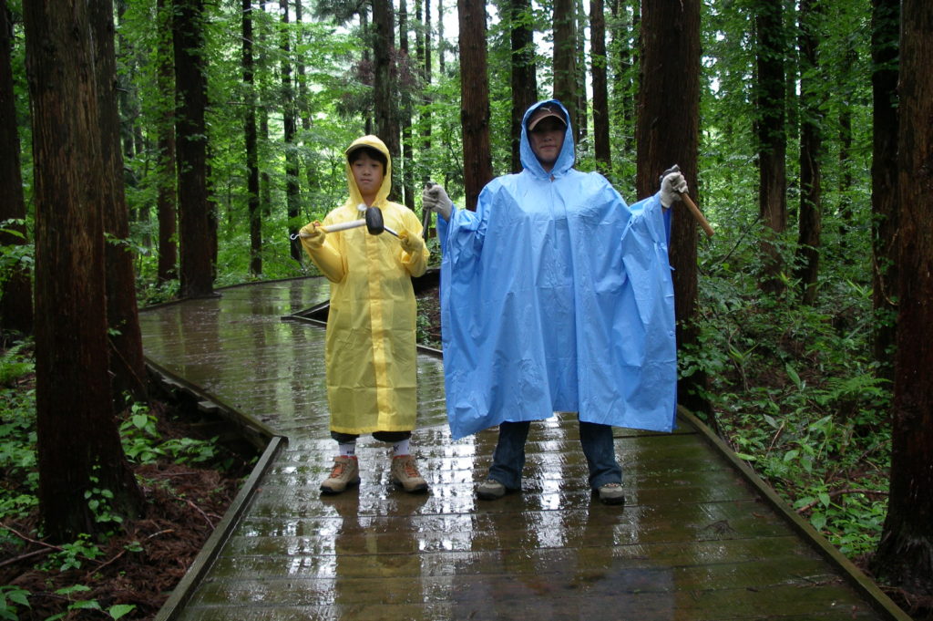 人の少ない林の中、ボードウォークをゆっくり歩くと、いろんな鳥や虫の声。でも、1週間後には、この道をたくさんの人が歩くことになるわけだな。そんなことを考えながら、カナヅチでトントンカチカチ。