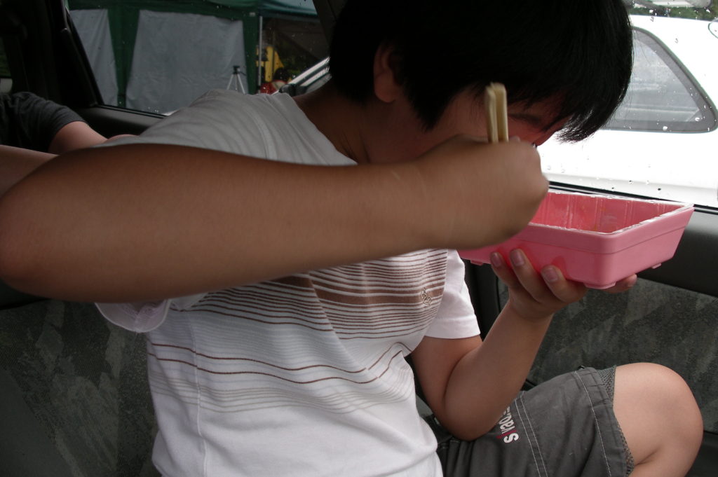 天候がイマイチ不安定だったので、ビールは我慢し、キャンプしないで、後ろ髪引かれる思いでそのまま日帰りに変更。大将から「運転には気をつけて」と声をかけられ、「家に着くまでがフジロックなんだゾ」と言われたみたいな感じがして、なんだか、小学生の頃の遠足を思い出した(笑)。