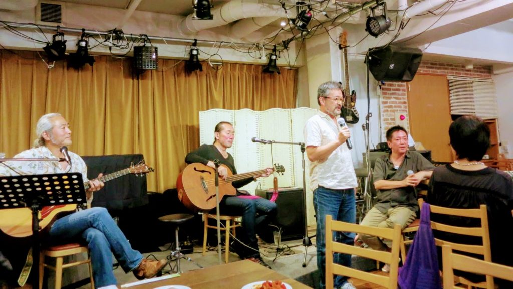 タクとナガちゃんと団地のじゃぶじゃぶ池で待ち合わせ。小さな愛車に大男二人と楽器を詰め込んで、まずは北川酒店へ。