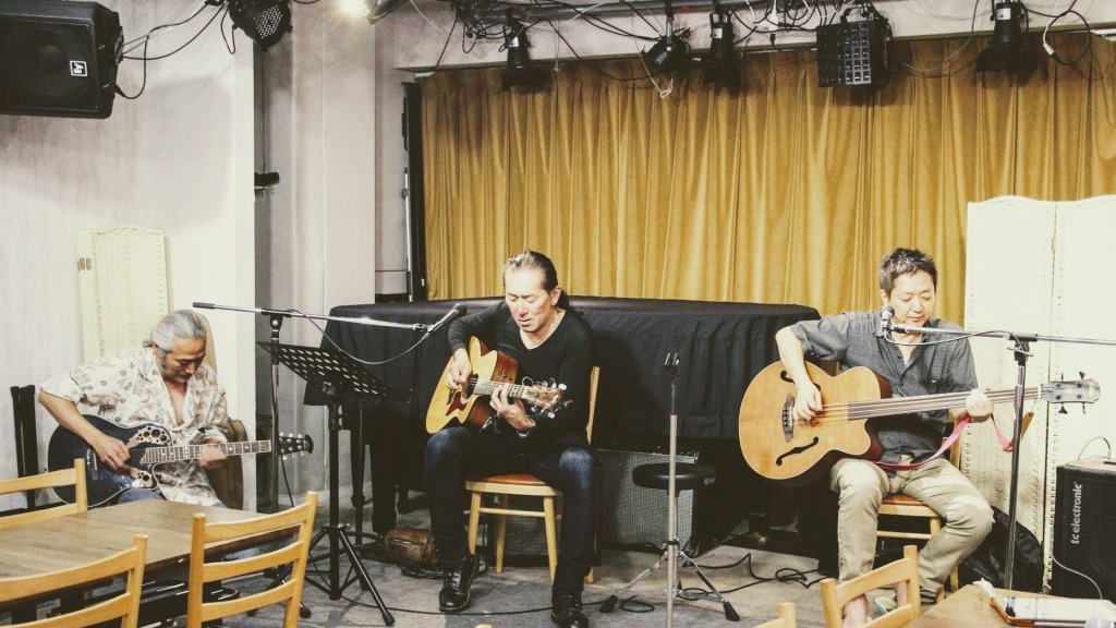 タクとナガちゃんと団地のじゃぶじゃぶ池で待ち合わせ。小さな愛車に大男二人と楽器を詰め込んで、まずは北川酒店へ。